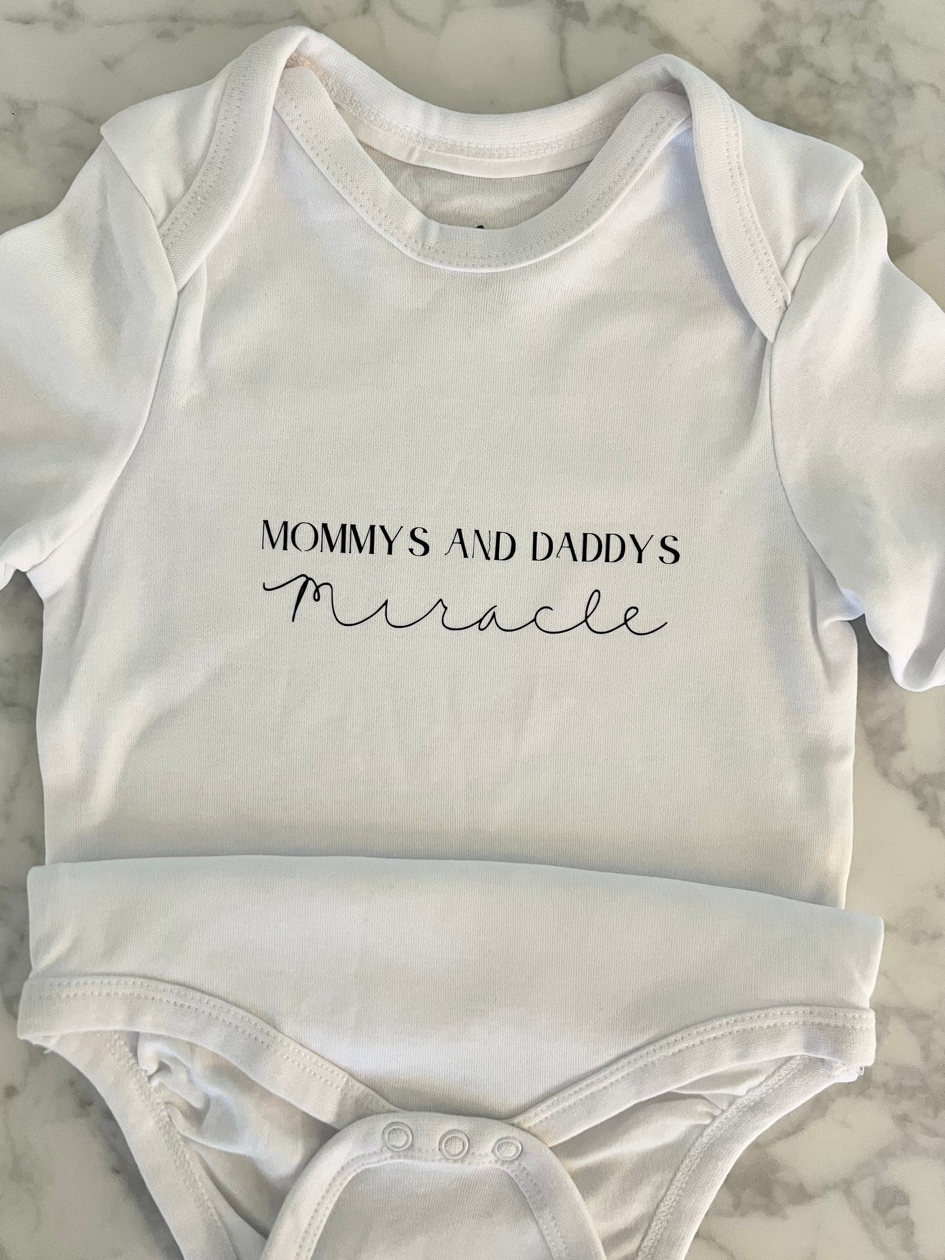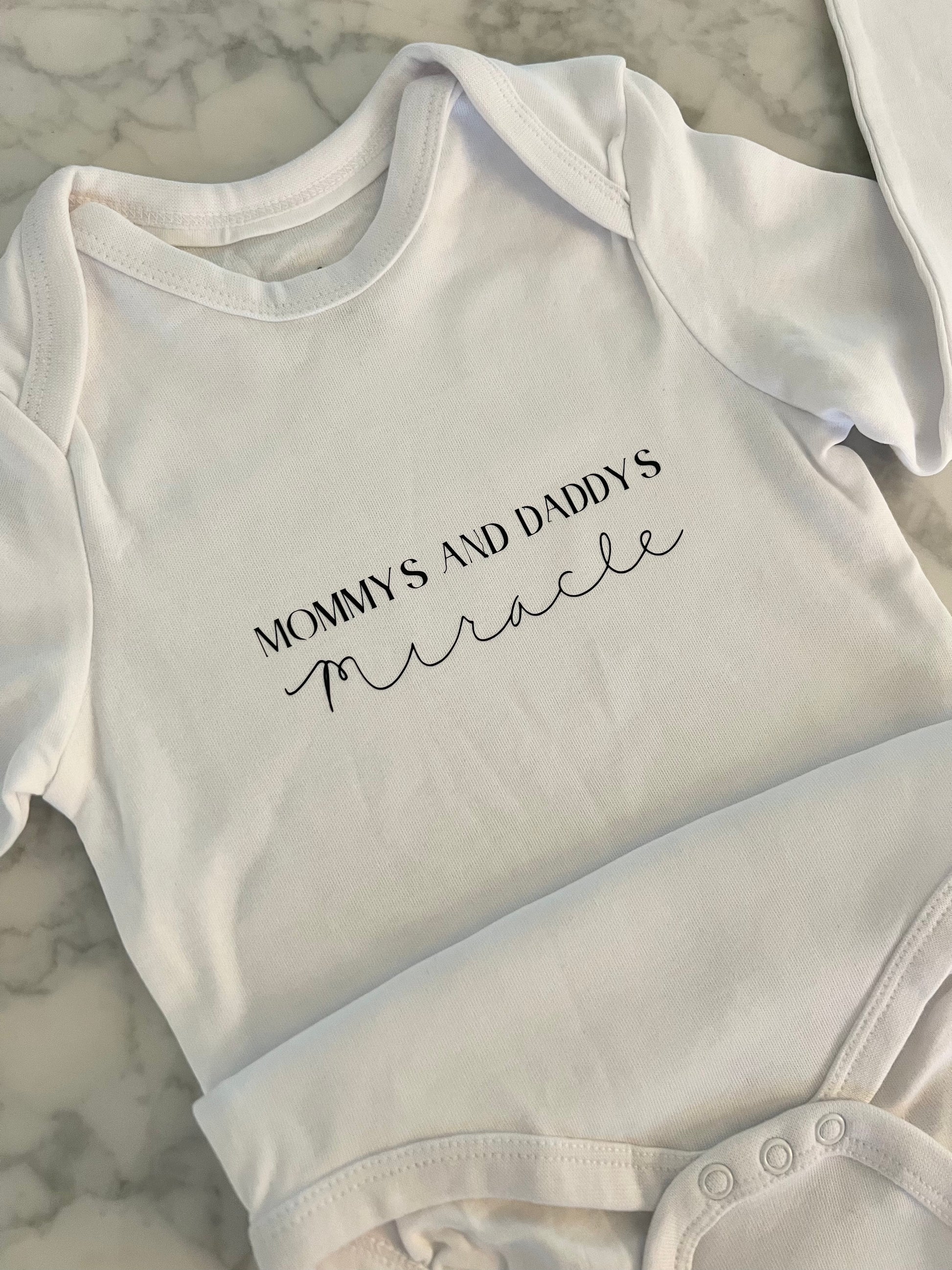 Dieser liebevoll gestaltete Babybody mit dem Schriftzug "Mommys & Daddy's Miracle" ist das perfekte Geschenk für froschgebackene Eltern, Babypartys oder als süsses Outfit für neugeborene.