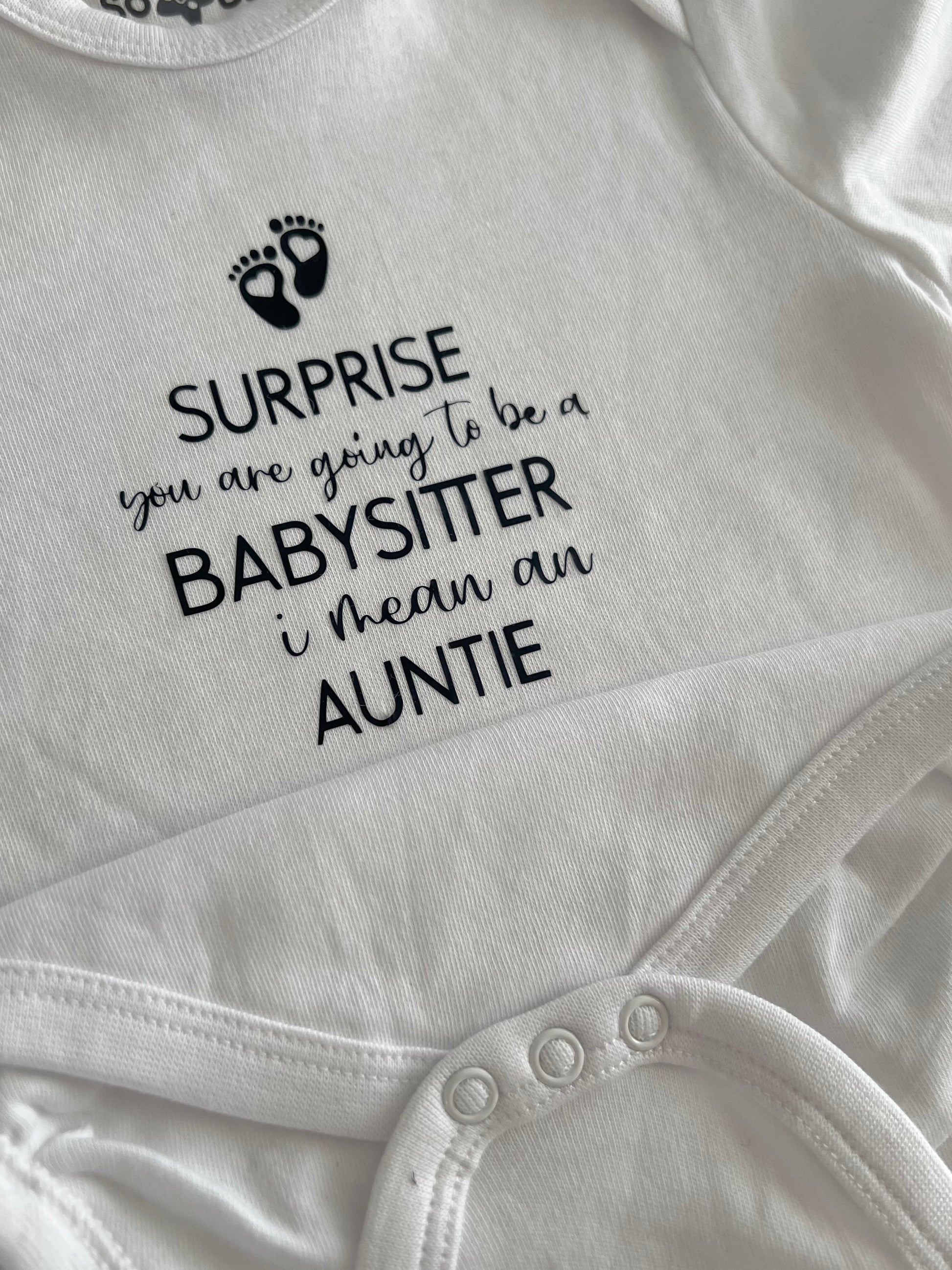 Dieser süsse Babybody mit dem Aufdruck "Surprise, you are going to be a Babysitter - I mean an auntie" ist die perfekte Art, die freudige Nachricht zu verkünden.