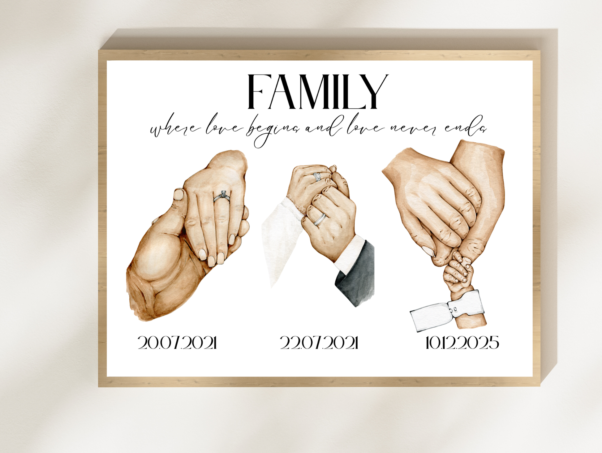 Ein liebevoll gestaltetes Poster, das eure ganz persönliche Familiengeschichte erzählt - von der Verlobung über die Hochzeit bis hin zur Geburt eures Babys.
