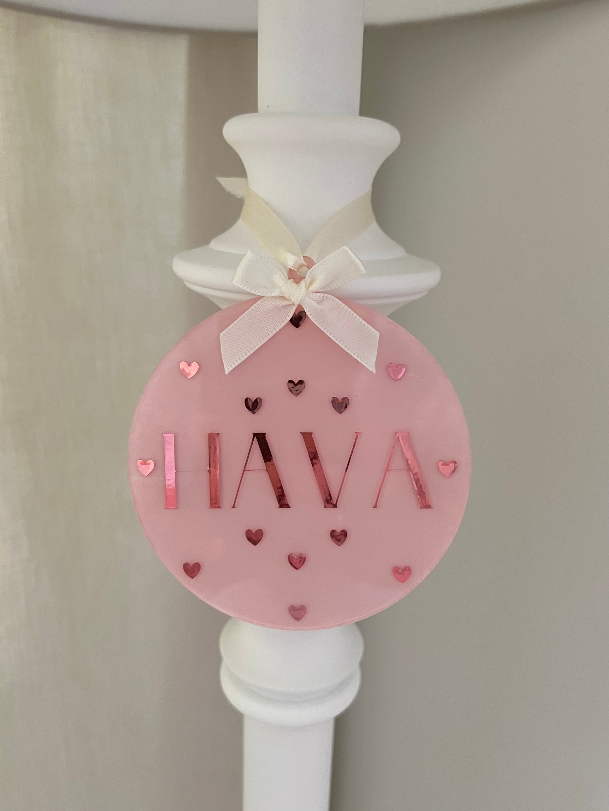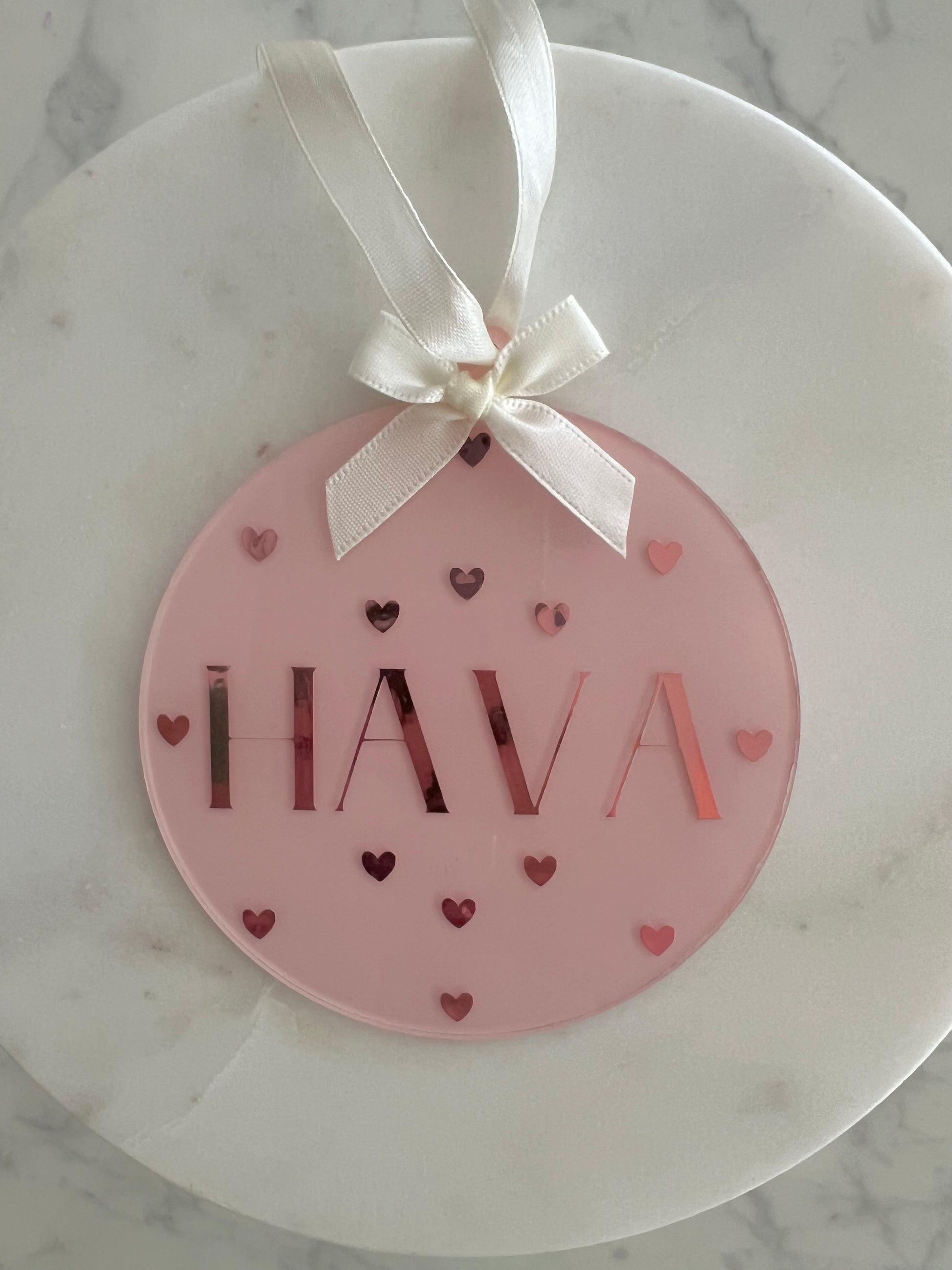 Der Name wird von zarten Herzchen umgeben. Eine edle Schleife aus Satin rundet das Design ab und ermöglicht ein einfaches Aufhängen.