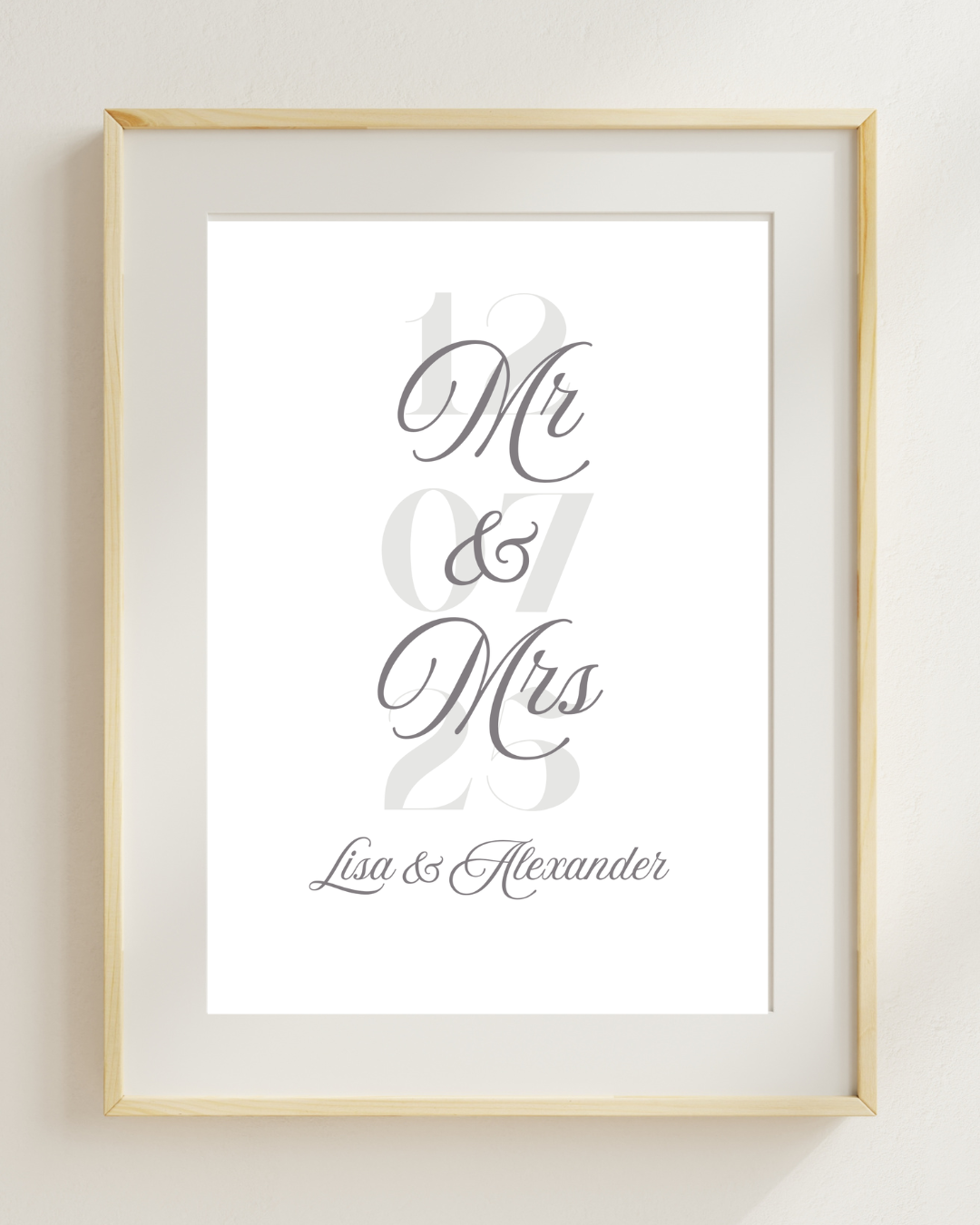 Ein zeitloses und elegantes Hochzeitsposter, das euren besonderen Tag stilvoll festhält. Mit Hochzeitsdatum, den Namen des Brautpaares und einer modernen, minimalistischen Typografie wird dieses Bild zu einer ganz persönlichen Erinnerung.