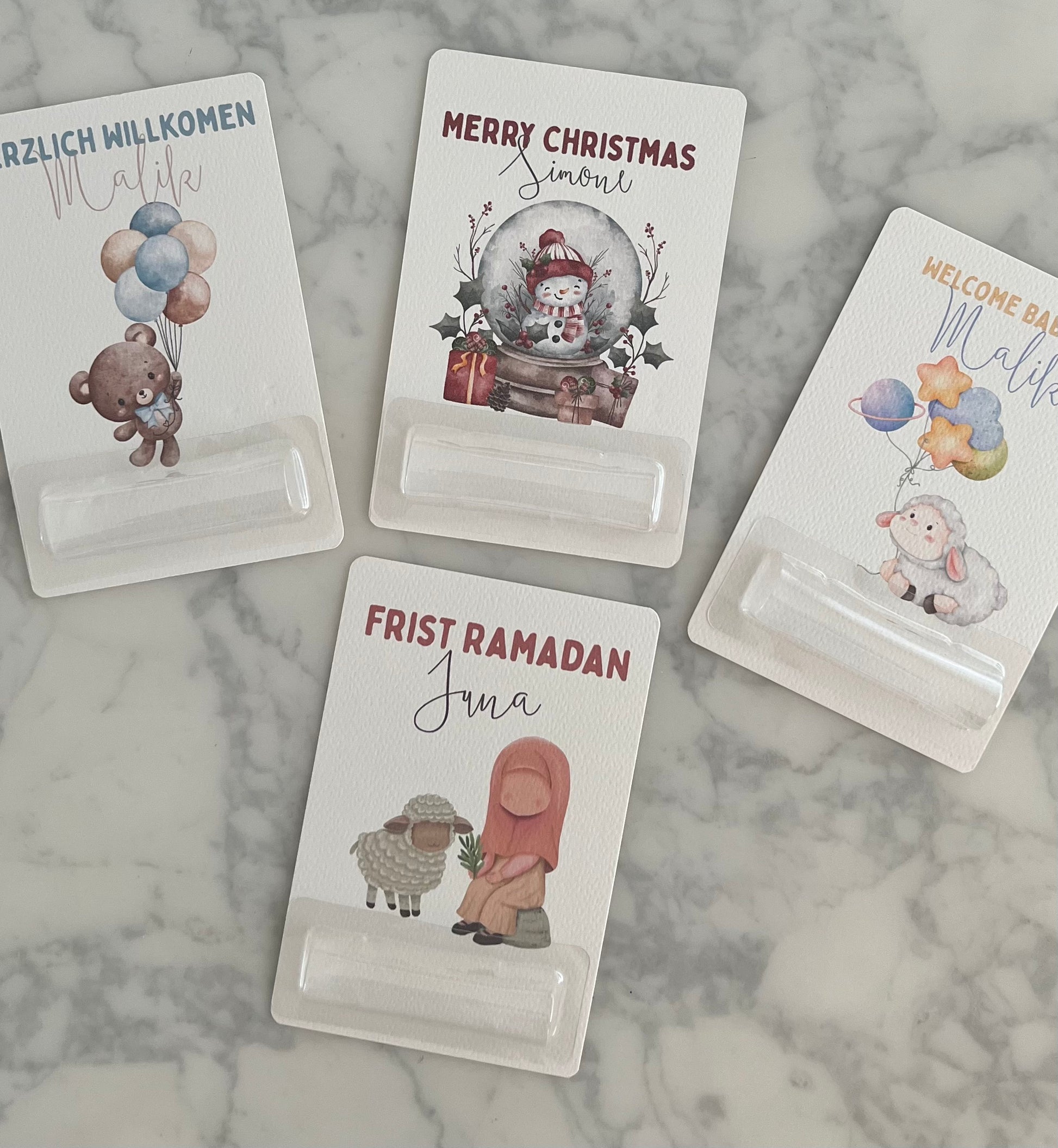 Unsere personalisierbaren Geldkarten sind die perfekte Möglichkeit, besondere Momente stilvoll festzuhalten und zu verschenken. Ob zur Geburt, Taufe, Weihnachten oder Ramadan - jede Karte wird mit einem liebevollen Motiv und dem individuellen Namen gestaltet.
