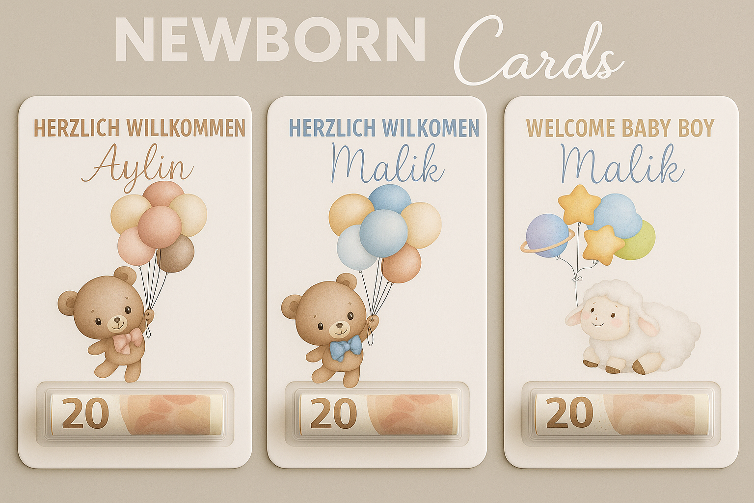 Diese liebevoll gestaltete Newborn Geldgeschenk-Karte ist die perfekte Art, ein neues Baby herzlich willkommen zu heissen! Mit entzückenden Motiven - ob Teddy mit Ballons oder süssen Schäfchen - und dem individuell personalisierten Namen wird jede Karte zu einem wunderschönen, einzigartigen Erinnerungsstück.