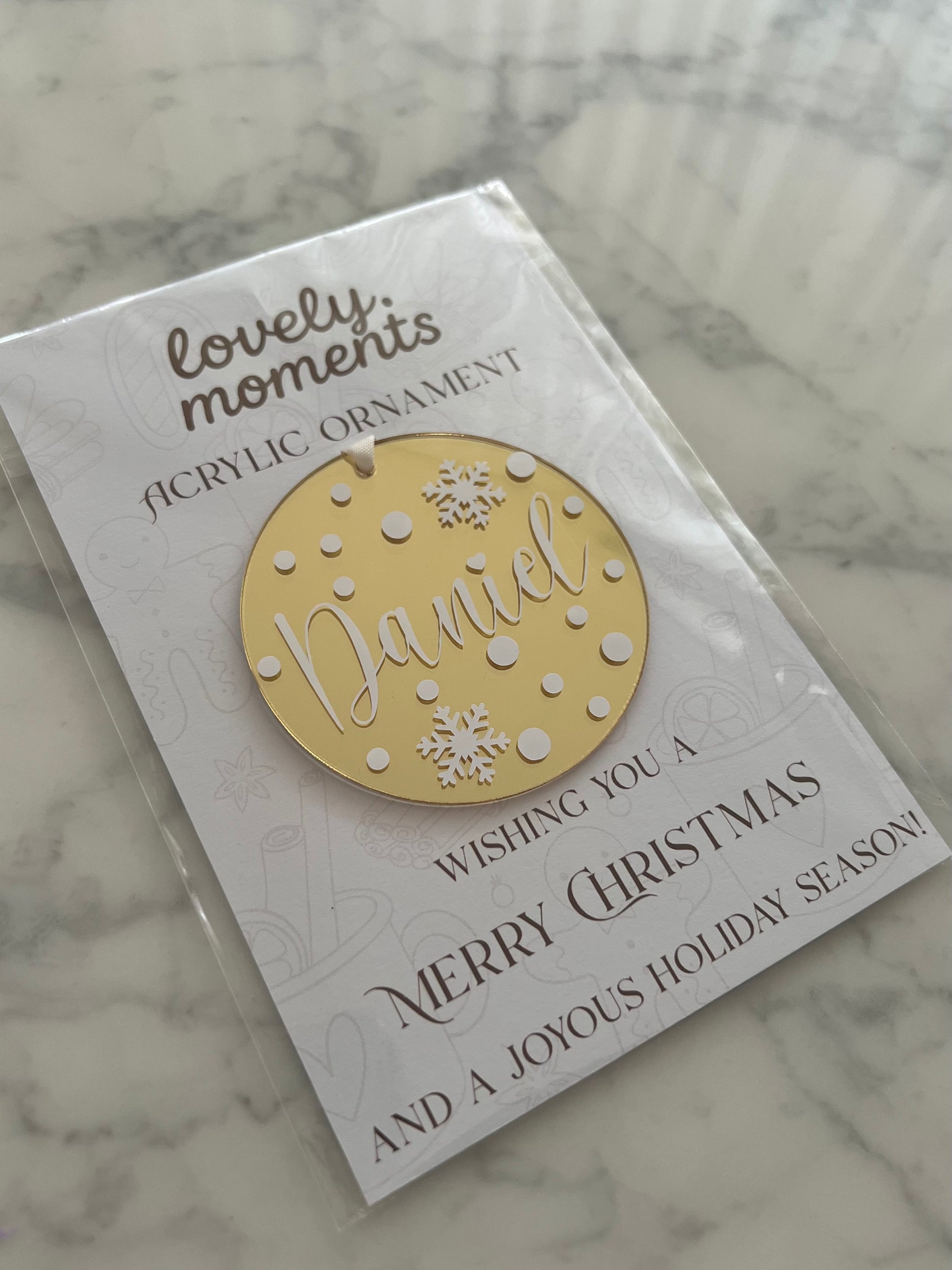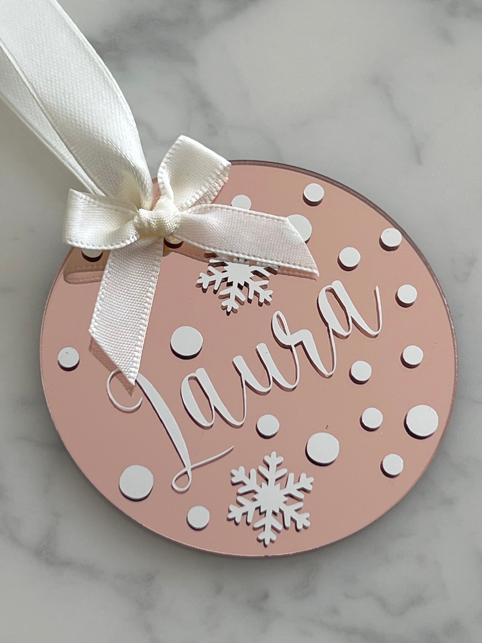 Unsere handgefertigten Weihnachtsbaum-Ornamente aus rosanem Spiegelglas werden mit deinem Wunschnamen personalisiert und liebevoll dekoriert. Perfekt als Geschenk für Familie, Freunde oder Kollegen - oder als stilvolle Ergänzung deiner eigenen Weihnachtsdekoration.